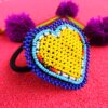 Handmade Huichol beaded heart hair tie in bold yellow and blue tones. A unique accessory that adds cultural elegance to any hairstyle.