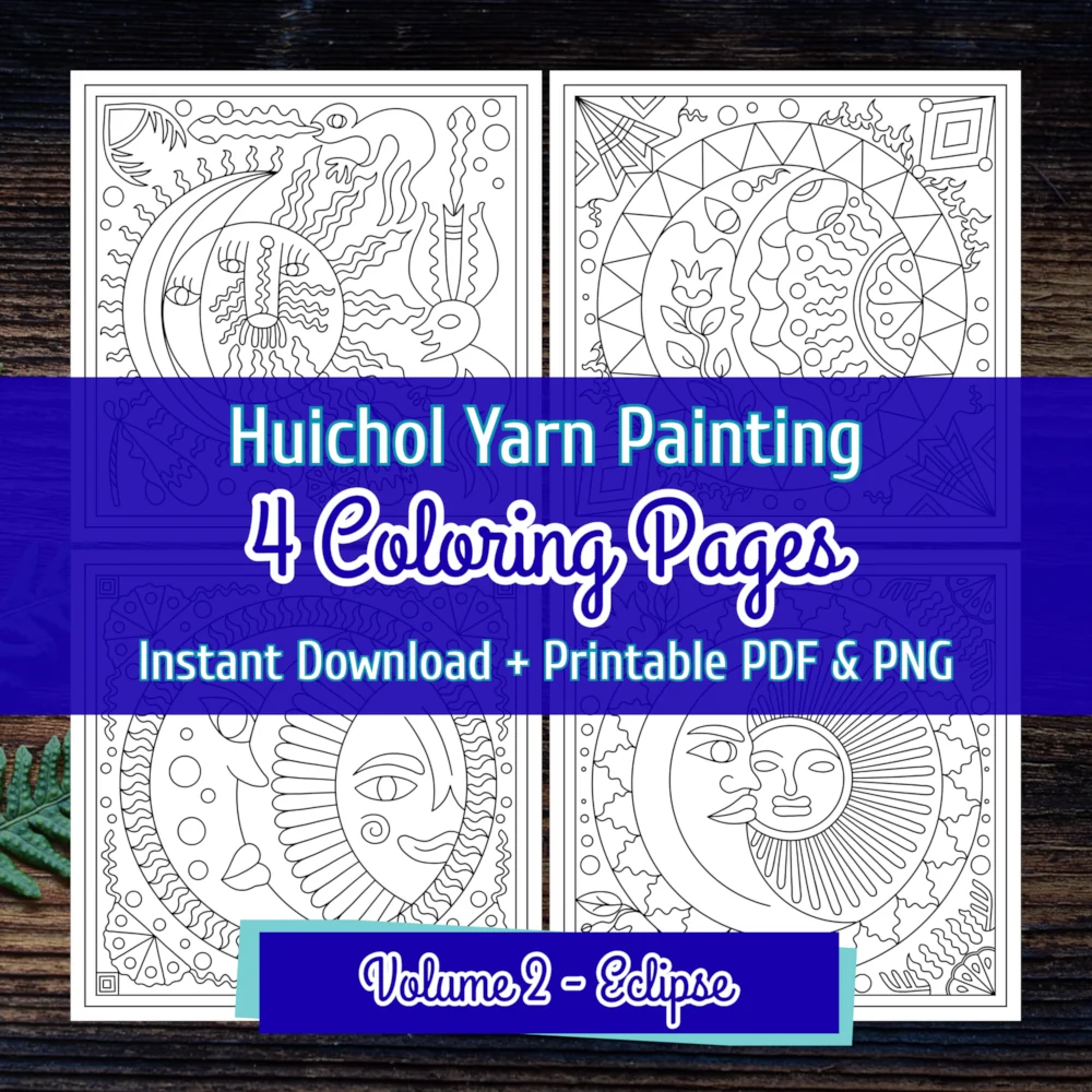These hand-drawn printable coloring pages feature Huichol yarn art designs of the Moon & Flower — unique symbols of nature and spirituality. Each page is hand-drawn in a clean black outline, ready for you to color and relax.
