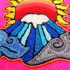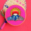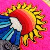 This handcrafted 6″ round yarn painting showcases a mountain paired with a sun motif on a solid wooden disc. Made by a Huichol artist in Nayarit, Mexico, the wool yarn is pressed into beeswax over wood using traditional techniques, creating a richly textured and meaningful piece that reflects cultural connections to landscape and light.