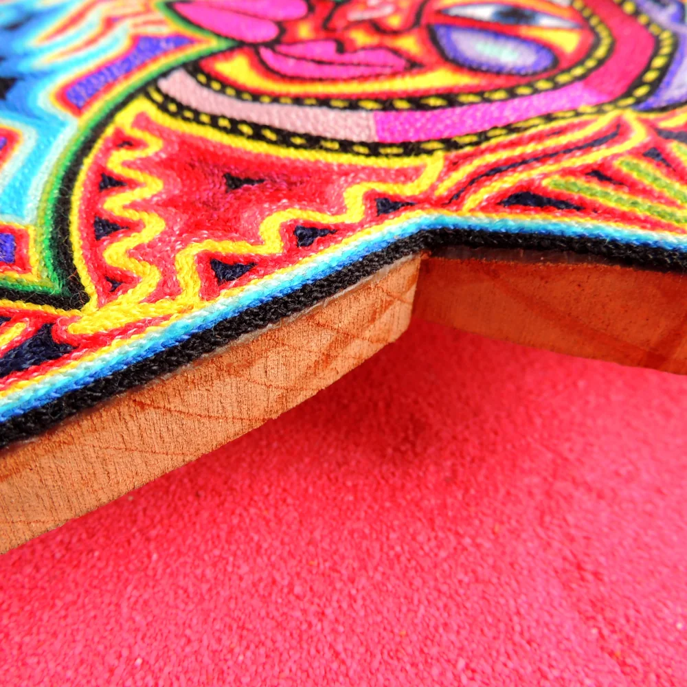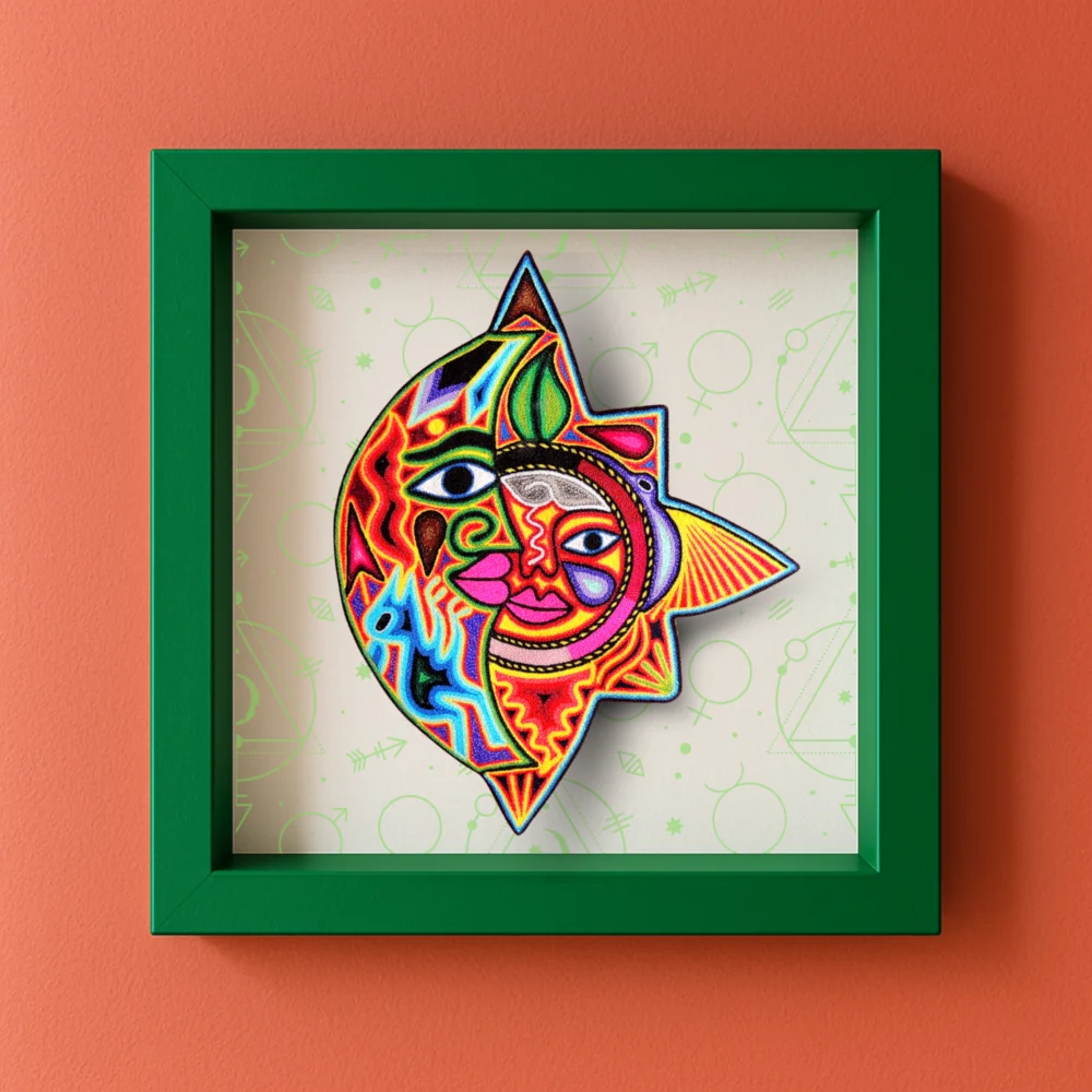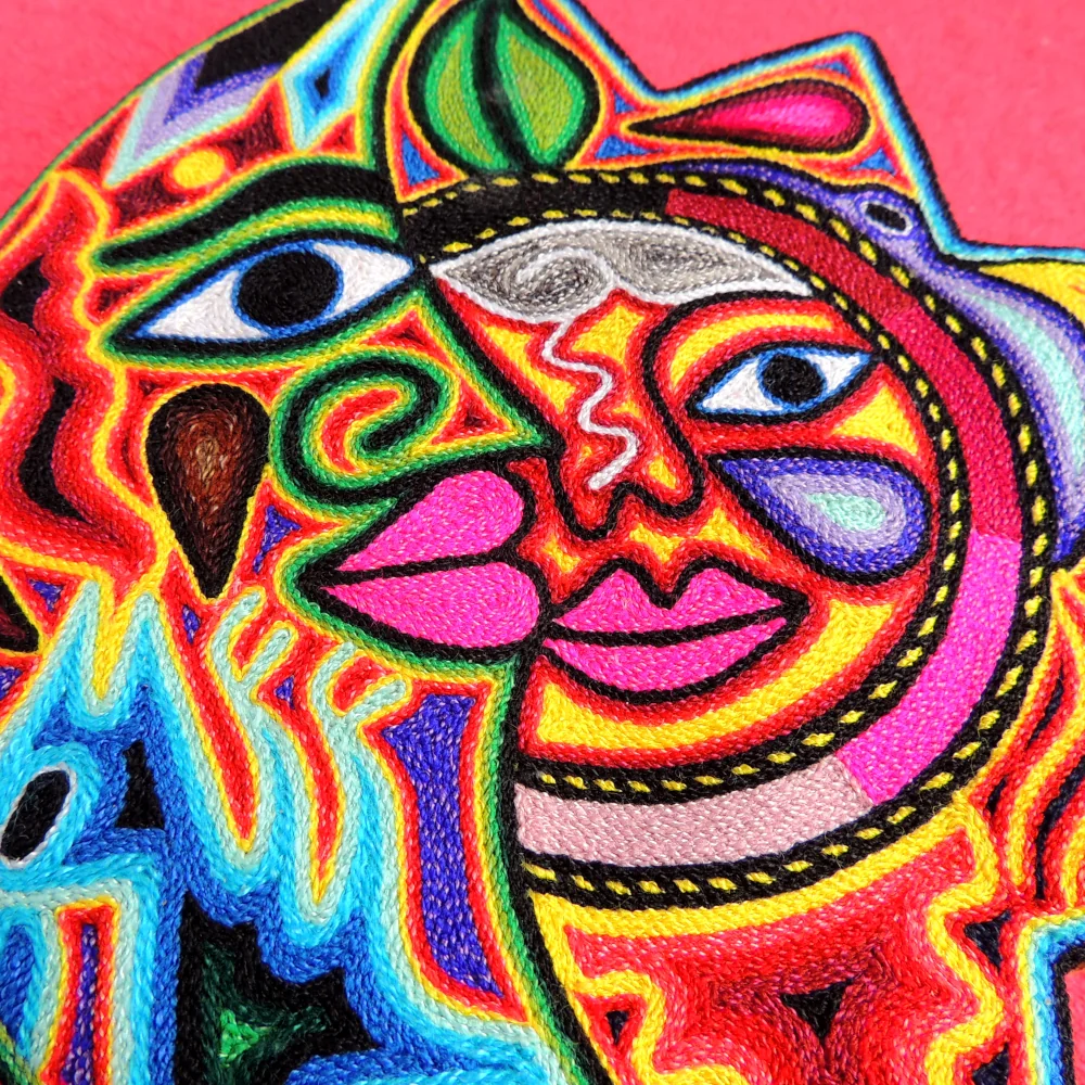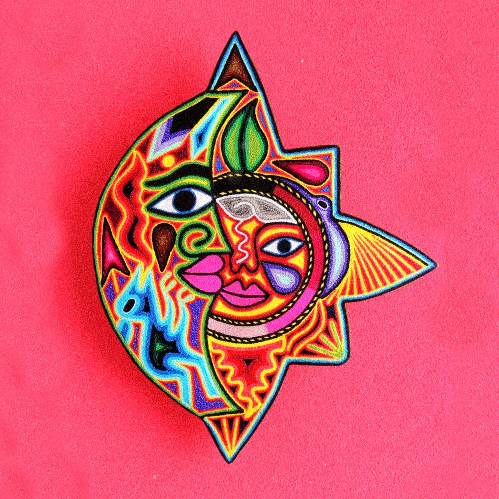 This Huichol yarn painting, known as a nierika, features the sun and moon in one unified design. Each detail is created by carefully placing colorful yarn onto a wax-covered base, following traditional Huichol techniques. With its rich patterns and symbolic meaning, this artwork brings an authentic cultural touch to any space.