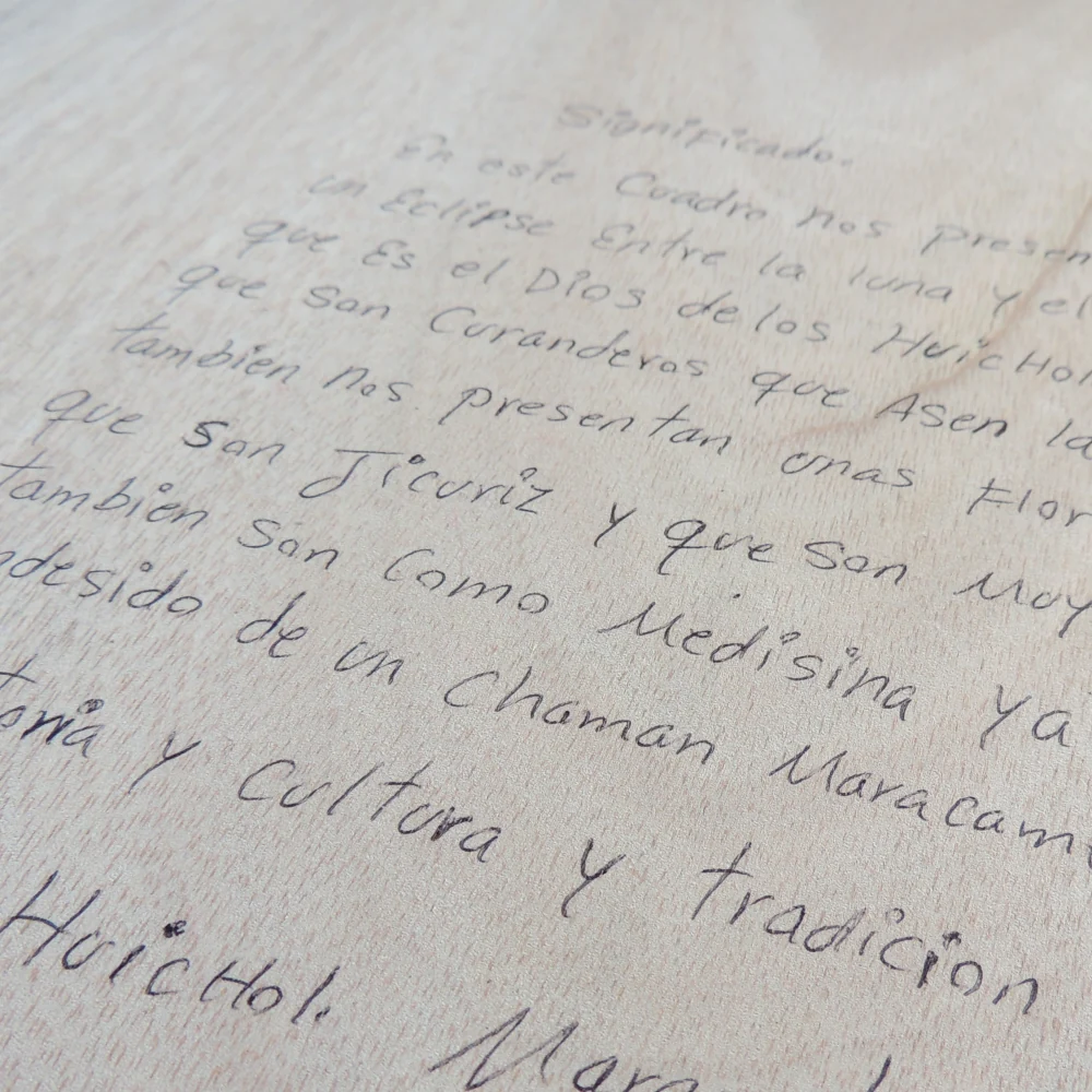 “In this painting, we see an eclipse between the moon and the Sun God, the deity of the Huichol maracames — healers who perform cleansing rituals. The artwork also depicts the creation of peyote flowers, called Hikuri, which are considered very sacred. These are used as medicine and are traditionally offered by maracame shamans. The piece reflects Huichol history, culture, and tradition.”