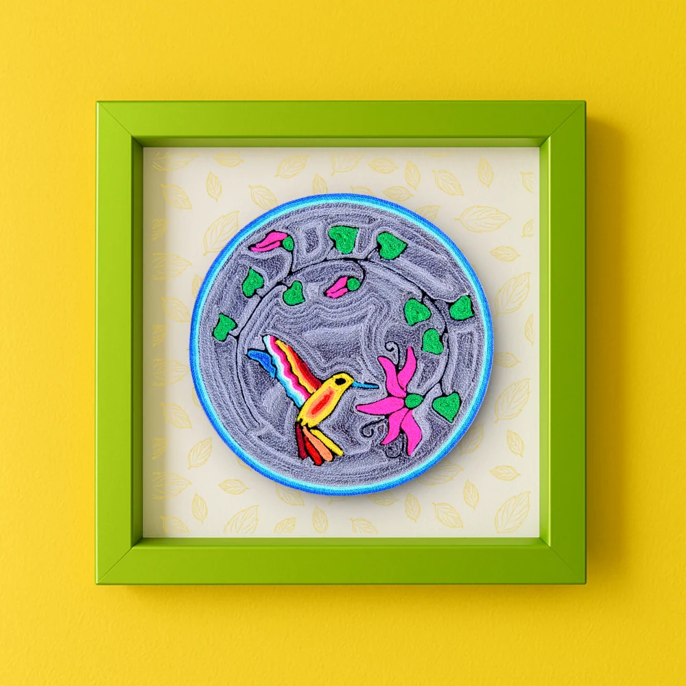 This Huichol yarn painting, called a nierika, shows a hummingbird flying toward a flower. The design is made with bright yarn pressed into beeswax on a wooden base, each line placed with care. Its round shape and detailed patterns make it easy to display on a wall, desk, or shelf.