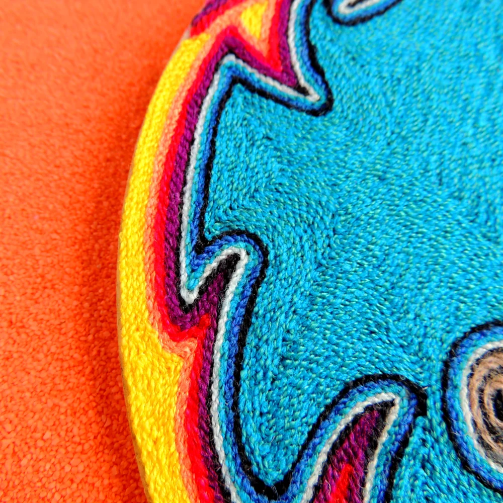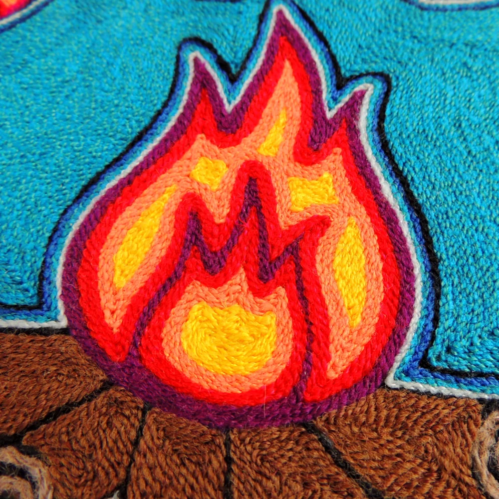 This Huichol yarn painting, called a nierika, shows the Fire God with flames. Each piece of yarn is carefully pressed into beeswax on a wooden base using traditional techniques. The design stands out with its strong colors and flowing shapes, making it an eye-catching piece for any wall or shelf.