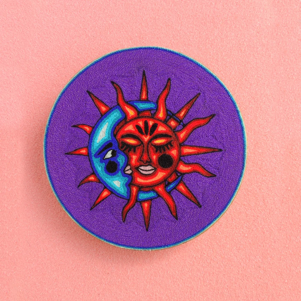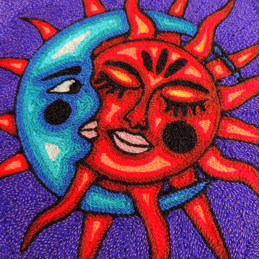 This Huichol yarn painting, called a Nierika, shows the sun and moon touching during an eclipse. The design is made using colorful yarn pressed into beeswax on a wooden base, forming a round picture that is easy to display. Its bold shapes and clear colors make it a fun and meaningful piece for any room.