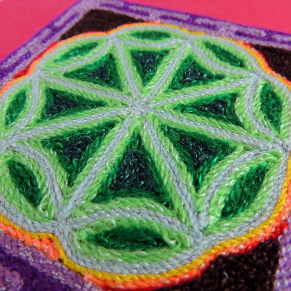 Handmade yarn painting showing a geometric peyote design in green tones.