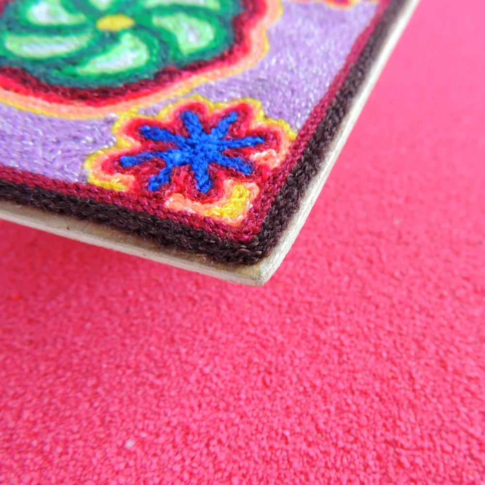 - Handmade Huichol yarn painting using the traditional wax-and-yarn technique