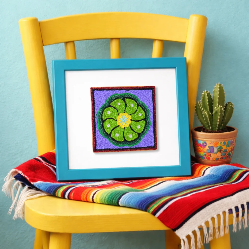 🌵 Huichol Yarn Painting – Blue & Green Peyote Nierika