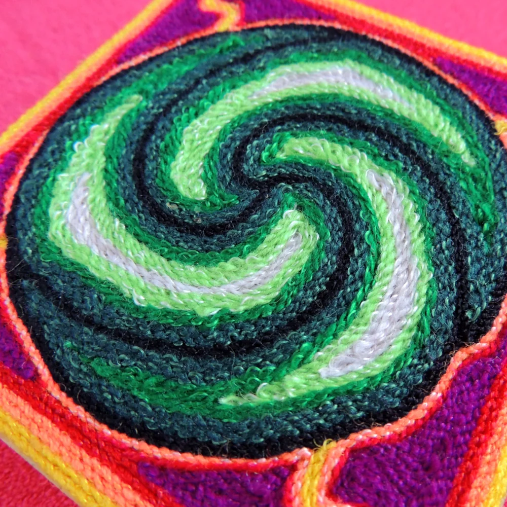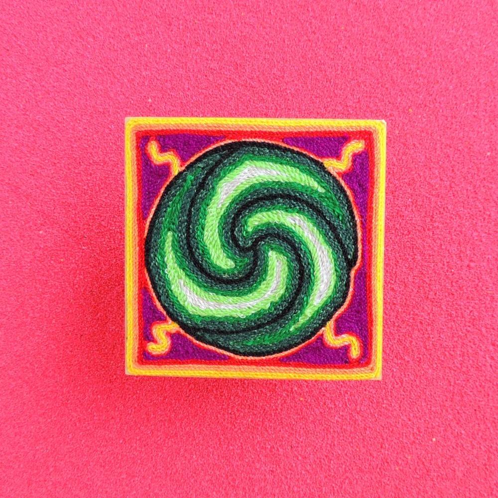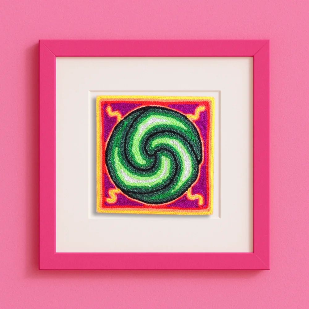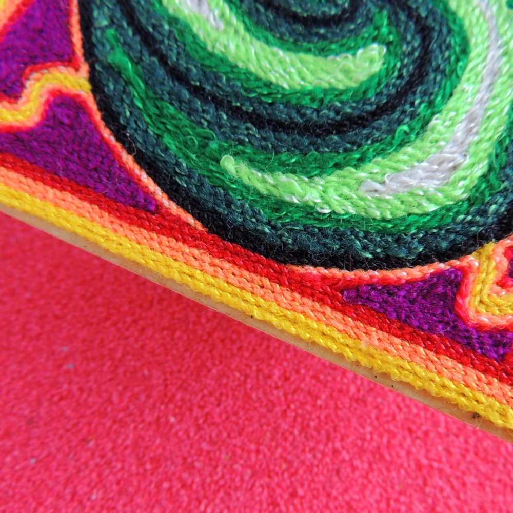 This little yarn painting has a green spiral that looks like a twirling peyote plant. Small white dots sit on each part of the swirl, and the bright colors around it make the center easy to see. It’s a cheerful piece that brings a pop of color to a desk or wall.