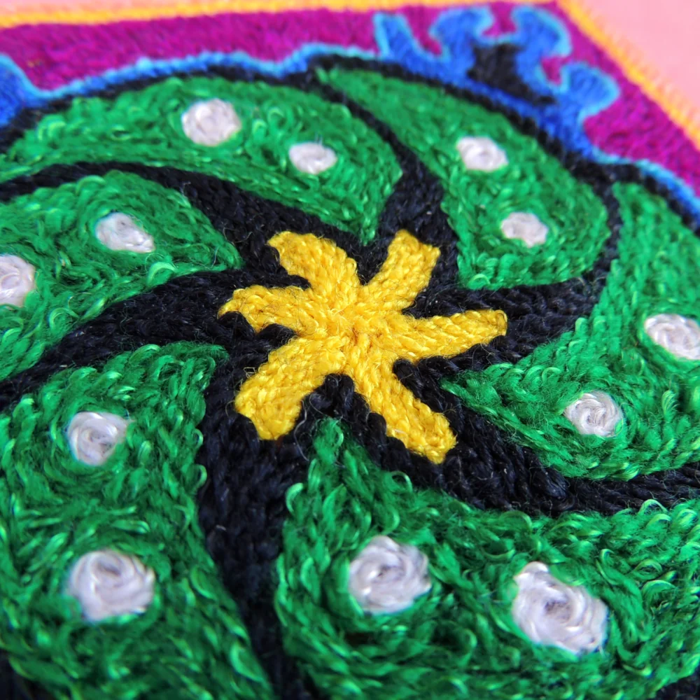 🌵 Huichol Yarn Painting – Blue & Green Peyote Nierika