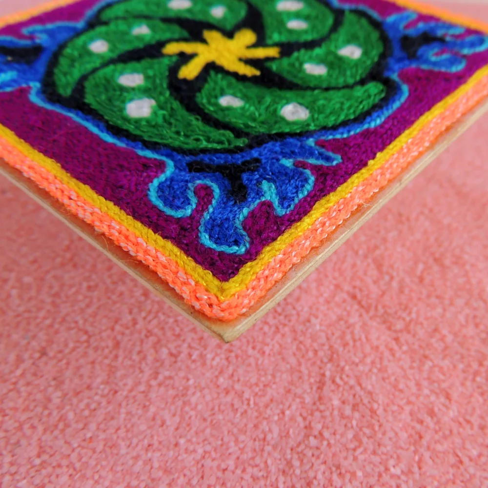 This tiny yarn painting has a round green peyote shape that looks like it’s spinning in the middle. The blue flame shapes around it make the colors stand out. It’s a fun, colorful piece that can brighten a small space in your room.