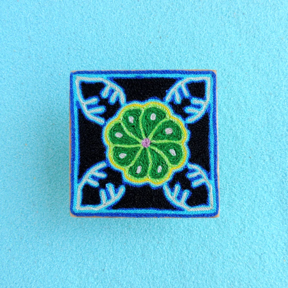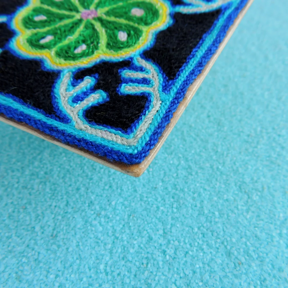 This Huichol yarn painting, called a nierika, shows a green peyote in the center with blue shapes in each corner. Yarn is pressed into beeswax on a wooden base, making clear lines and a soft texture. Its small square size fits well on shelves, desks, or small wall spaces.