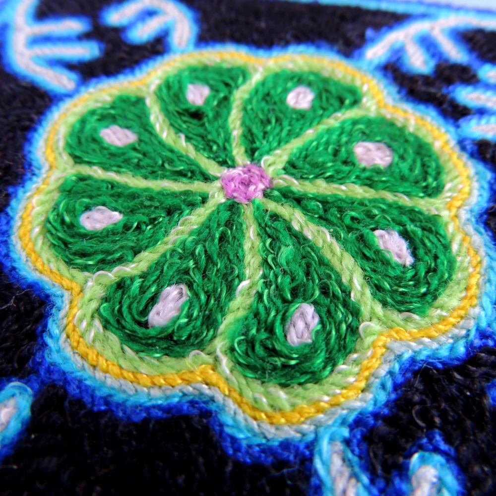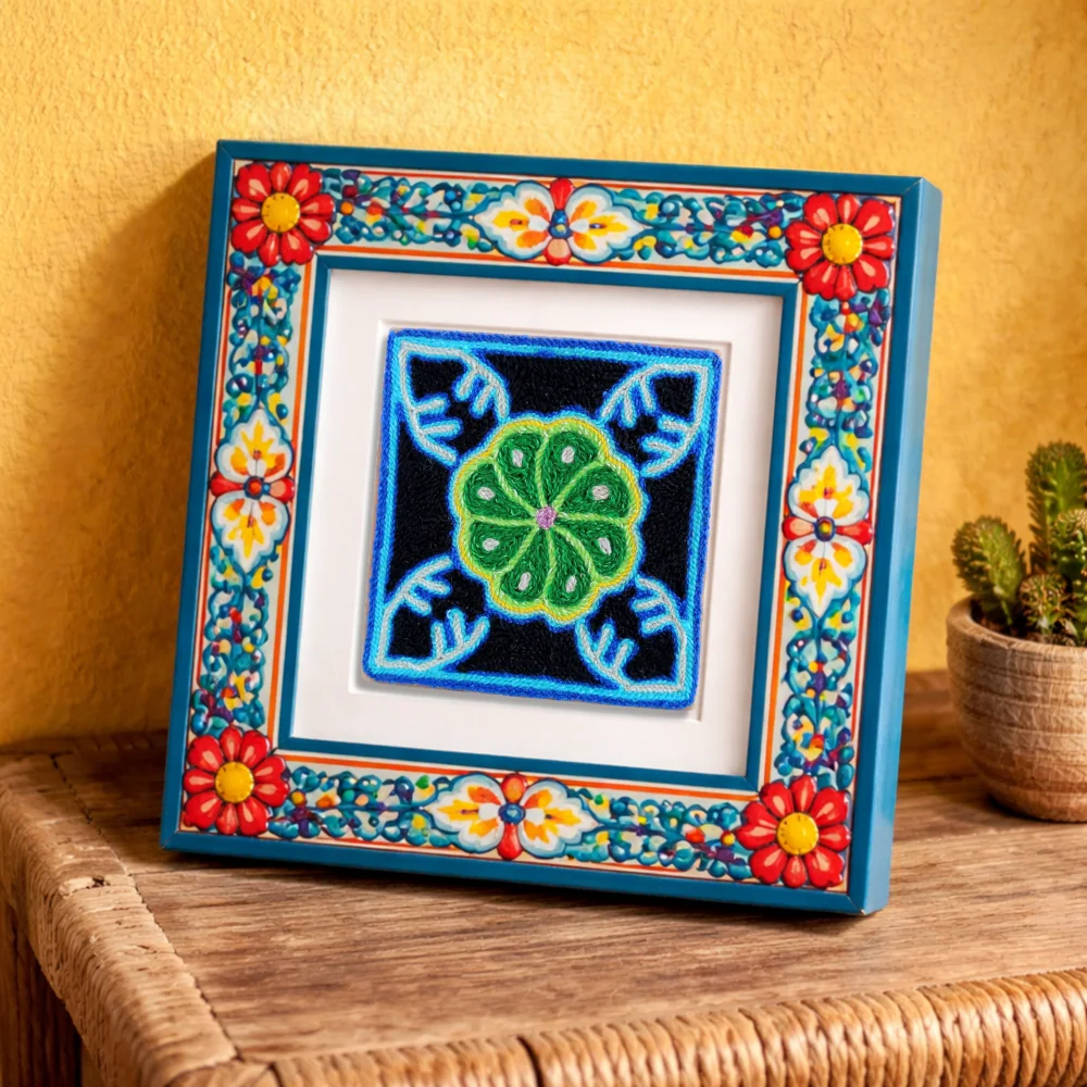 🌵 Huichol Yarn Painting – Blue & Green Peyote Nierika