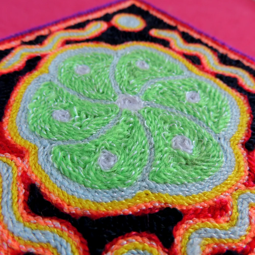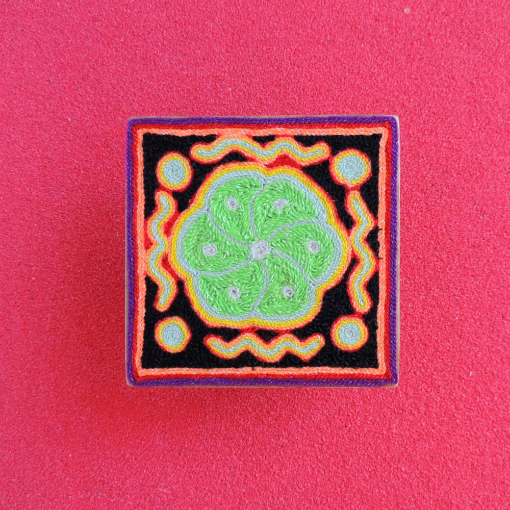 - Handmade Huichol yarn painting using the traditional wax-and-yarn technique
