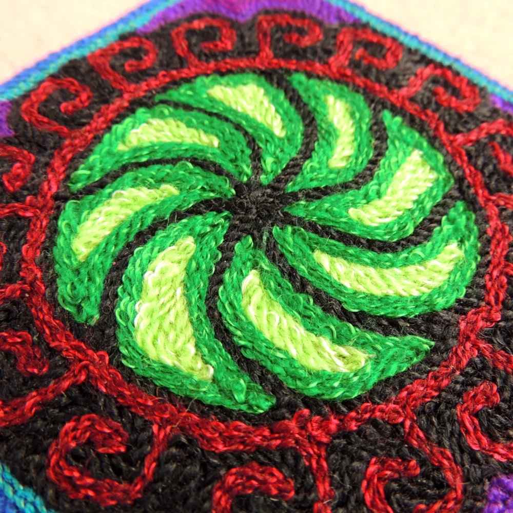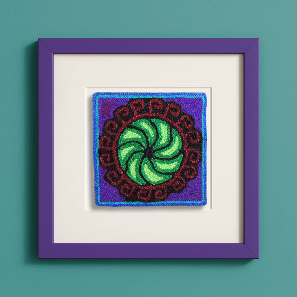 🌵 Huichol Peyote Nierika – Green Spiral Yarn Painting (10cm)