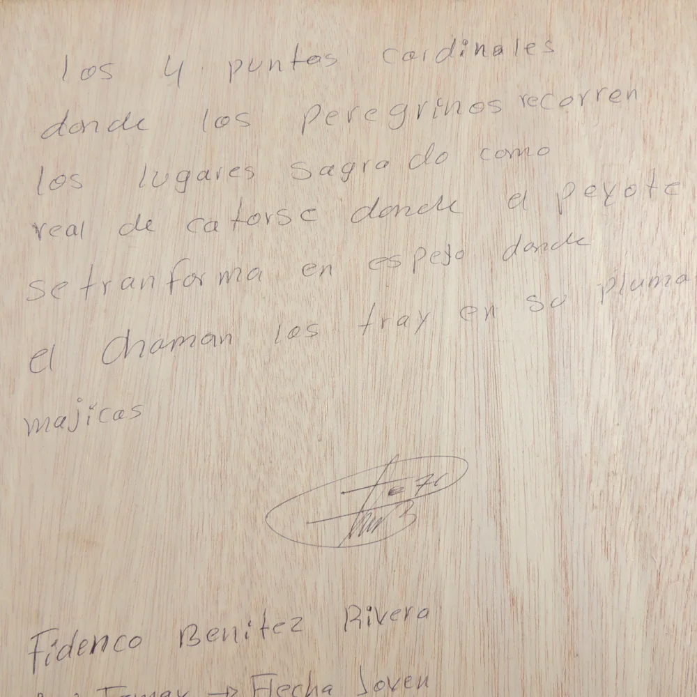 “The four cardinal directions, where pilgrims journey through sacred places such as Real de Catorce, where peyote transforms into a mirror, and where the shaman carries them in his magical feather.”
