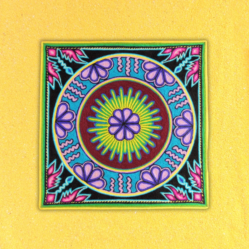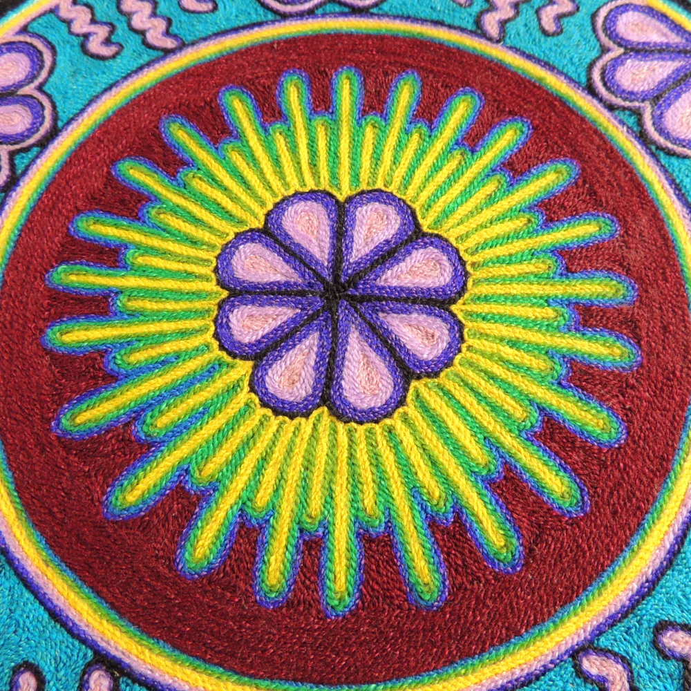 🌵 Huichol Yarn Painting with Peyote Motif in Circular Pattern